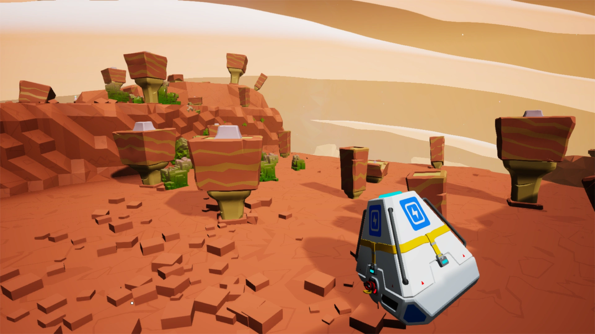 - Cráteres Pequeños: Este es uno de los biomas más comunes en Desolo, tienen una Tierra amarilla con rayas anaranjadas en el suelo con el gris de las Llanuras Grises que se filtran en algunos de los cráteres. Generalmente hay plantas pequeñas que pueden ser cosechadas para el Orgánico que crece en estos cráteres, mientras que la Esfalerita, el Compuesto y la Resina también se encuentran comúnmente en este bioma. Este es también uno de los principales biomas para encontrar pequeños Restos y Ayudas de Investigación de EXO Dynamics.