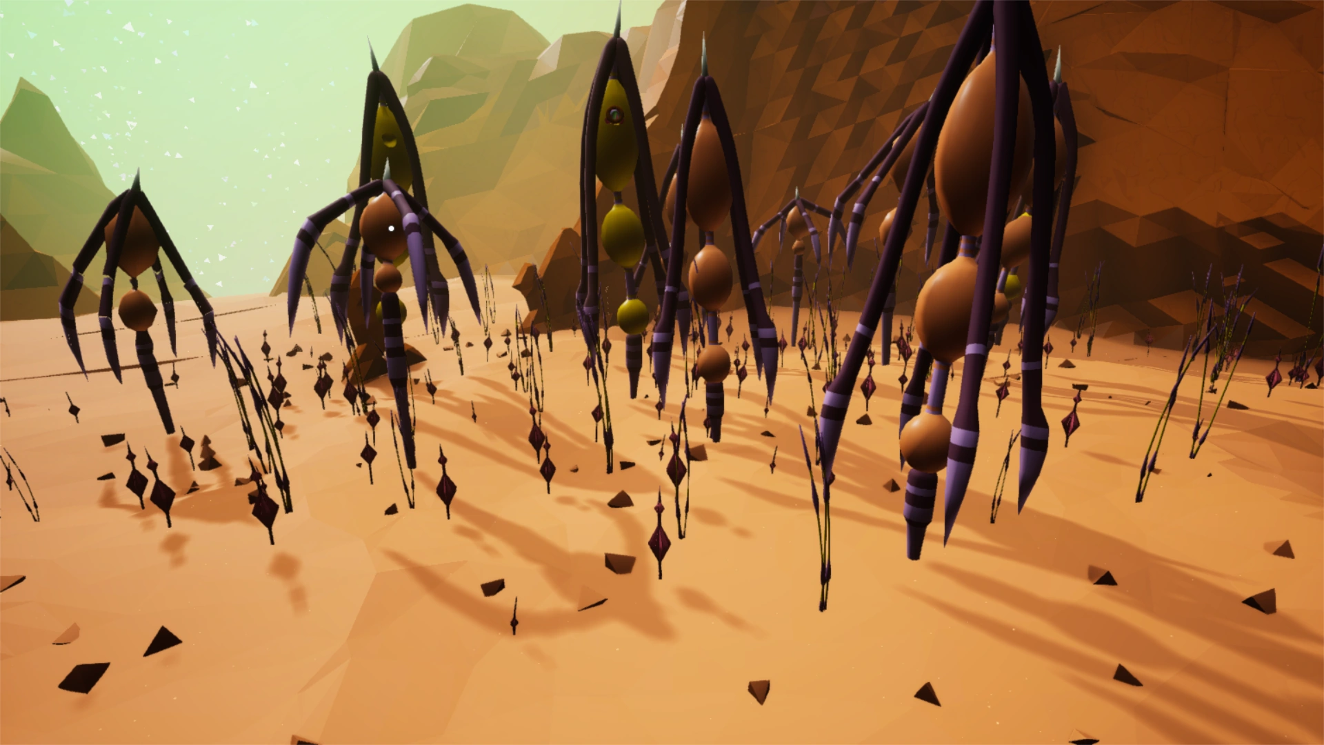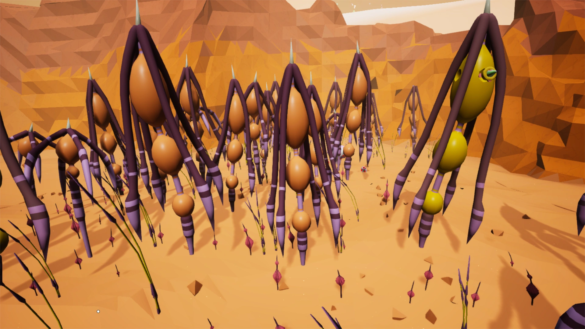 - El Gran Desierto: El Gran Desierto es el bioma más grande de Calidor, y es el mejor lugar para encontrar Resina, y Compuesto. Tiene un color de Tierra naranja claro, similar a la arena del desierto de la Tierra. Hay muchos cactus y otras plantas desérticas dispersas, con muchas dunas que varían en altura y forma. Este es el mejor bioma para construir un explorador, ya que la tierra es más asfixiante que cualquier otro bioma. La única desventaja de construir una base aquí es que hay una Flora peligrosa que vive en este bioma, (como la que está en primer plano en la segunda foto) y que la meseta a veces obstruye el sol en ciertos ángulos, bloqueando la mejor fuente de poder.