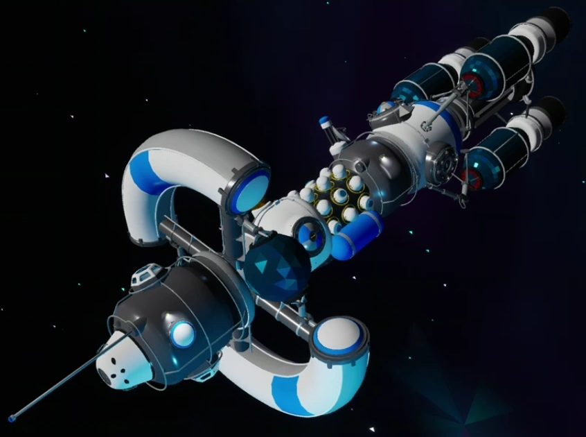 The LREV (or Long Range Exploration Vehicle) is the spaceship that brings Astroneers into the star system where Astroneer takes place. When starting a new game, Astroneers are sent off in dropships, either when starting a new world or when the player has completed the Gateway Portal puzzle. The interior of the LREV is seen in more detail during the final cutscene. The room is filled with devices, packages, research catalogs, and the blue tanks seen on oxygenators and rovers. At the far end, there is a window looking out into space along with a table with a laptop and what looks to be a burrito, implying that there is most likely gravity inside of the LREV. You can find a wrecked LREV on Glacio that has good items in it, when you remove the hard soil under it with a Terrain Tool (that has a Drill Mod 3 installed,) the LREV wreck can be moved with a winch.