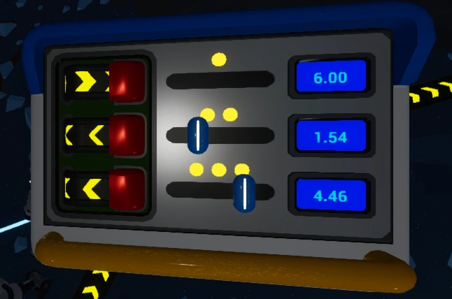 The Splitter is a module that is capable of changing the output speed of Power to multiple modules. To use it, you must plug it into a power source and then plug the other cables into Modules you want to split the power between. You can use the control panel to increase or decrease the power flowing through the cables. Multiple Splitters can be wired together for a larger power control grid. Do take note that power can only either go into the Splitter or out of the Splitter. Power cannot go both ways on the same power cable. The Splitter has no mounting points and cannot be stored on a platform.