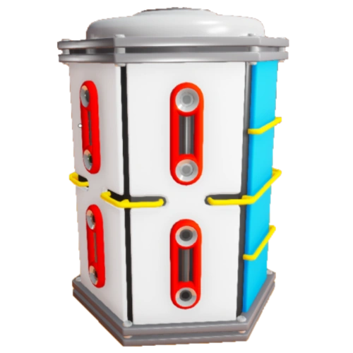 The Large Storage Silo A features eight medium attachment slots. Attaching eight Medium Storage Silos, the capacity can be raised from 16 to 192 small items. Using eight medium canisters, up to 256 resource nuggets can be stored.